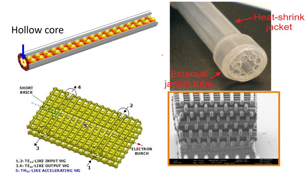 superconductive technologies. Last, but not least, in a guiding structure the interaction length will be maximized with respect to state-of-the-art side-pumped gratings. Project DOSE aims at demonstrating particle acceleration in a compact high-gradient LINAC based on a hollow-core waveguide, e.g. in a photonic crystal (PC) geometry. This activity will focus on devices operating in W-band (around 100 GHz), where prototypes can be fabricated and experimentally characterized with reasonable cost and complexity. As a matter of fact, in the last years research on dielectric accelerators has attracted increasing interest worldwide, since compact dielectric accelerators allow a huge increase of the accelerating gradient to be achieved without recurring to complex plasma-based acceleration schemes. This in turn will bring to a considerable reduction of size and cost, and an improvement of robustness, reliability and availability on a global scale with respect to metallic LINACs operated in S band which are currently used in medicine and healthcare. The proposed paradigm can be further extended by opening the way to the realization of laser-pumped tabletop and even on-chip particle accelerators by scaling down the geometrical features to optical wavelengths. In order to achieve these ambitious goals, project DOSE includes four partners with multidisciplinary skills in electromagnetic propagation, modelling of hollow-core waveguides and